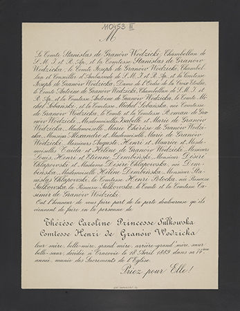 [Nekrolog. Incipit] M Le Comte Stanislas de Granów Wodzicki, [...] Thérse Caroline princesse Sułkowska Comtesse Henri de Granów Wodzicka leur mère [...]