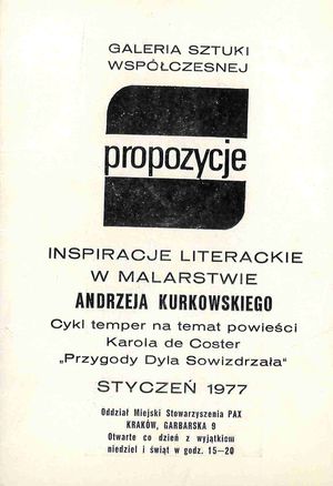 | Inne tytuły: | cykl temper na temat powieści Karola de Coster "Przygody Dyla Sowizdrzała" Galeria Sztuki Współczesnej "Propozycje", styczeń 1977, Oddział Miejski Stowarzyszenia Pax, Kraków, Garbarska 9 |