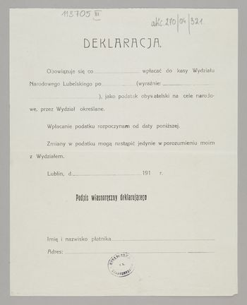 | Inne tytuły: | Obowiązuje sie co ... wpłacać do kasy Narodowego Wydziału Lubelskiego ... |