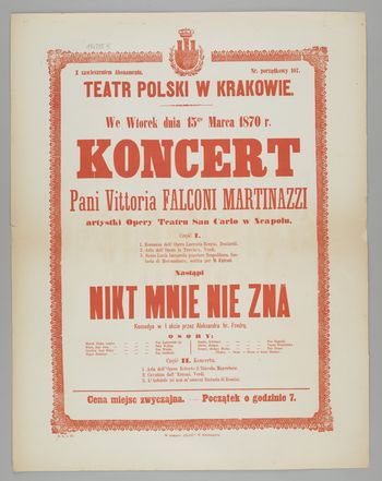 | Inne tytuły: | we wtorek dnia 15go marca 1870 r. Koncert Pani Vittoria Falconi Martinazzi artystki Opery teatru San Carlo w Neapolu Koncert Pani Vittoria Falconi Martinazzi artystki Opery teatru San Carlo w Neapolu, nastąpi Nikt mnie nie zna, komedya w 1 akcie przez Aleksandra hr. Fredrę Teatr Polski w Krakowie |