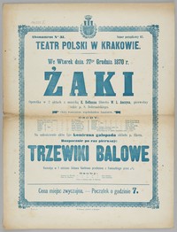 | Inne tytuły: | [Incipit:] We wtorek dnia 27go grudnia 1870 r. Żaki operetka w 2 aktach z muzyką K. Hoffmana, libretto W.L. Anczyca, pierwotny szkic pana S. Dobrzańskiegop Teatr Polski w Krakowie |