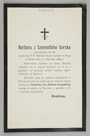 [Nekrolog. Incipit] Ś. P. Barbara z Szemiothów Gorska przeżywszy lat 96 [...]