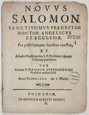 Sanctissimvs Præceptor Doctor Angelicvs Et Ecclesiæ Pro posse humano laudibus euectus, Et Ad ædes Prædicatorias S. P. Dominico dicatas Posnaniæ peroratus