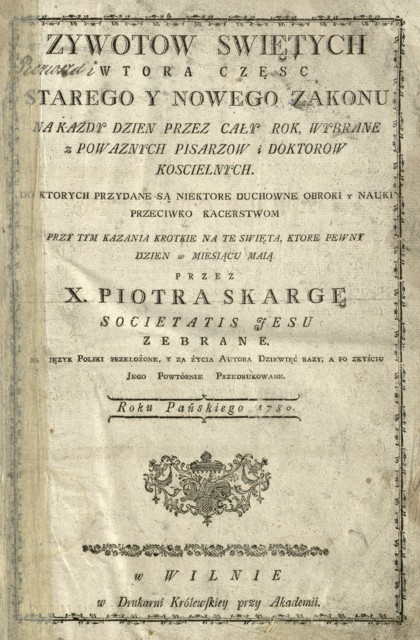 | Inne tytuły: | na każdy dzień przez cały rok [...] przytem kazania krótkie na te święta, które pewny dzień w miesiącu mają Ku temu kazania krótkie na te święta, które pewny dzień w miesiącu mają przez ks. Piotra Skargę societatis iesu przebrane, uczynione i w język polski przełożone Żywotów świętych pierwsza część Żywot świętych Starego i Nowego Zakonu na każdy dzień przez cały rok do których przydane są niektóre duchowne obroki i nauki przeciw kacerstwom dzisiejszym, tam gdzie się żywot którego doktora starożytnego położył ku temu kazania krótkie na te święta, które pewny dzień w miesiącu mają |