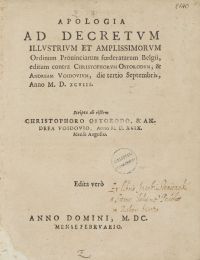 Apologia ad decretvm Illvstrivm et Amplissimorvm Ordinum Prouinciarum foederatum Belgii, editum contra Christophorvm Ostorodvm, et Andream Voidovivm, die tertio Septembris Anno M. D. XCVIII