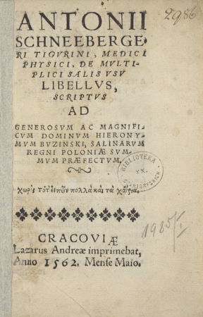 | Inne tytuły: | De Mvltiplici Salis Vsv Libellvs Scriptvs Ad Generosvm Ac Magnificvm Dominvm Hieronymum Buzinski, Salinarum Regni Poloniae Summum Praefectum De multiplici salis usu libellus |