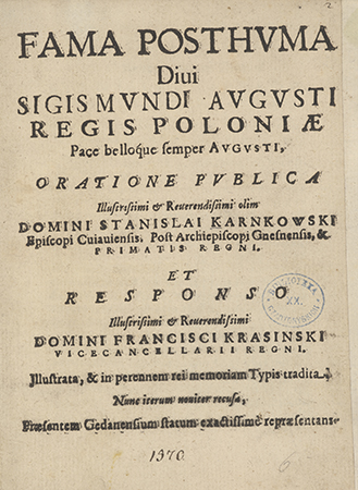 Fama posthvma Diui Sigismvndi Avgvsti Regis Poloniae Pace belloque semper Avgusti, Oratione pvblica Illustrissimi & Reuerendissimi olim Domini Stanislai Karnkowski Episcopi Cuiauiensis, Post Archiepiscipi Gnesnensis, & Primatis Regni et Responso Illustrissimi & Reurendissimi Domini Francisci Krasinski Vicecancellarii Regni