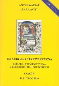 | Inne tytuły: | 15 lutego 2020 książki - mickiewicziana z księgozbioru J. Dolińskiego 128 aukcja antykwaryczna "Rara Avis" Sto dwudziesta ósma aukcja antykwaryczna |