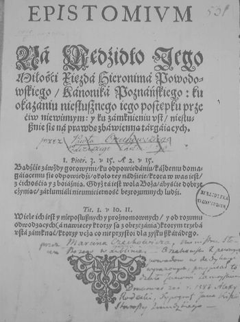 Epistomivm na Wędzidło Jego Miłości Xiędza Hieronima Powodowskiego, kanonika poznańskiego: ku okazaniu niesłusznego iego postępku przeciw niewinnym: y ku zamknieniu vst niesłusznie się na prawdę zbawienną targaiących [...]