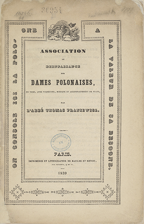 | Inne tytuły: | en vers, avec vignettes, musique et accompagnement de piano =Towarzystwo Dobroczynności Dam Polskich Błogosławieni, którzy litość mają |
