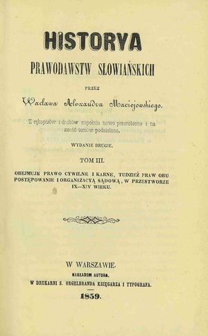 | Inne tytuły: | Obejmuje prawo cywilne i karne, tudzież praw obu postępowanie i organizacyą sądową, w przestworze IX-XIV wieku Historya prawodawstw słowiańskich T. 3, |