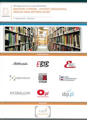 | Inne tytuły: | Agregacja metadanych w skali kraju - kierunki rozwoju Federacji Bibliotek Cyfrowych 11 stycznia 2012 r., Warszawa Cyfrowa przyszłość, czyli biblioteki w erze informacji - kierunki rozwoju bibliotek XXI wieku Długoterminowe archiwizowanie obiektów cyfrowych Ewaluacja jakości bibliotek cyfrowych w ujęciu architektury informacji Obiekty cyfrowe: taksonomie, tworzenie kolekcji, punkty dostępu Pragmatyka tworzenia bibliotek cyfrowych - zarządzanie procesami Profil, zasady gromadzenia, uzupełnianie zasobów Zasady tworzenia bibliotek cyfrowych |