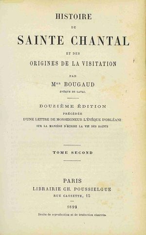 | Inne tytuły: | Histoire de Sainte Chantal et des origines de la visitation T. 2 Lettre de Monseigneur l'évèque d'Orléans sur la manière d'écrire la vie des saints |