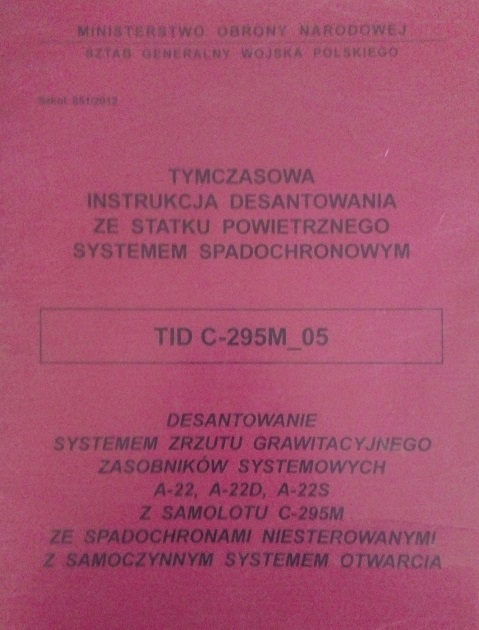 Tymczasowa instrukcja desantowania ze statku powietrznego systemem spadochronowym: Desantowanie systemem zrzutu grawitacyjnego zasobników systemowych A-22, A-22D, A-22S z samolotu C-295M ze spadochronami niesterowanymi z samoczynnym systemem otwarcia : TID C-295M_05