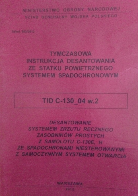 Tymczasowa instrukcja desantowania ze statku powietrznego systemem spadochronowym: Desantowanie systemem zrzutu ręcznego zasobników prostych z samolotu C-130E, H ze spadochronami niesterowanymi z samoczynnym systemem otwarcia : TID C-130_04 w.2