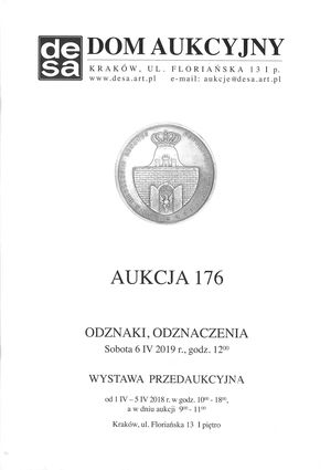 | Inne tytuły: | odznaki, odznaczenia sobota, 6 IV 2019 r., godz. 12:00 wystawa przedaukcyjna od 1 IV - 5 IV 2018[!] r. w godz. 10.00 - 18.00 a w dniu aukcji 9.00 - 11.00, Kraków [...] |
