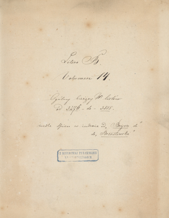 Inne tytuły:Litera B: Boyen - Brzostowski Korespondencja różnych osób od XVII do początku XIX wieku adresowaną do Sieniawskich, Denhoffów i Czartoryskich [Korespondencja Sieniawskich : Korespondencja różnych osób adresowana do Sieniawskich, Denhoffów i Czartoryskich] T. 14,