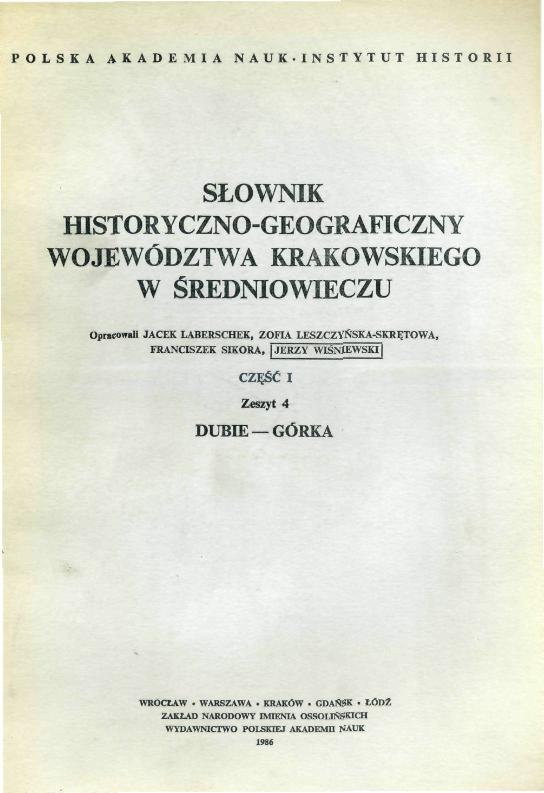 | Inne tytuły: | Słownik historyczno-geograficzny województwa krakowskiego w średniowieczu A-Borek Dubie - Górka Górka - Isepek Słownik historyczno-geograficzny ziem polskich w średniowieczu T. 5-7, |