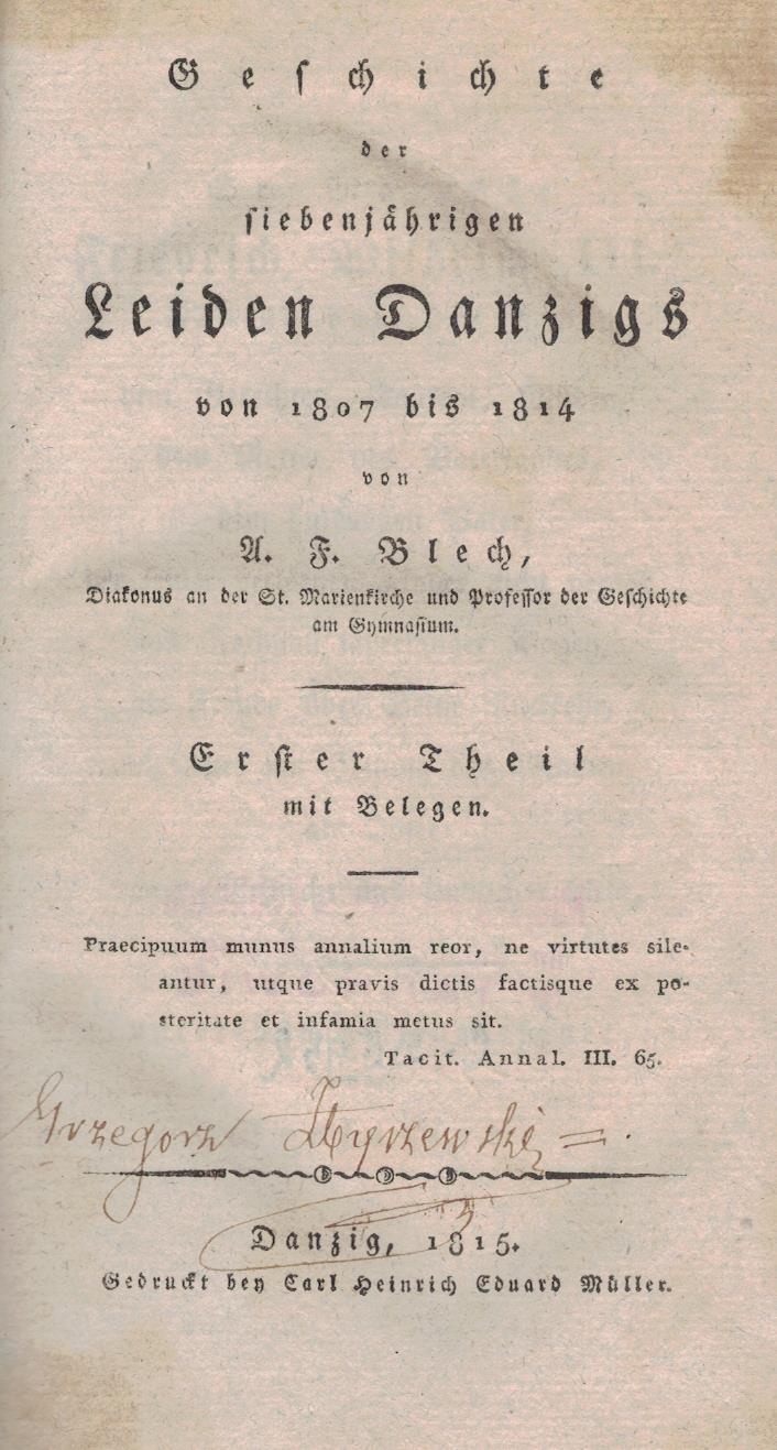 | Inne tytuły: | Geschichte der siebenjahrigen Leiden Danzigs von 1807 bis 1814 Tl 1 |
